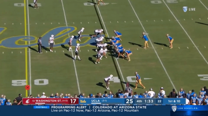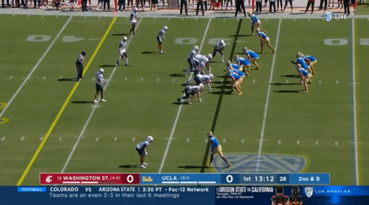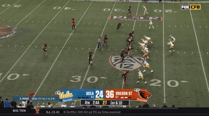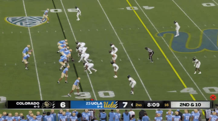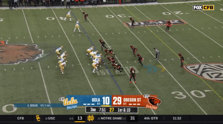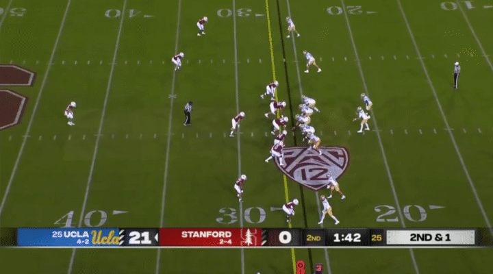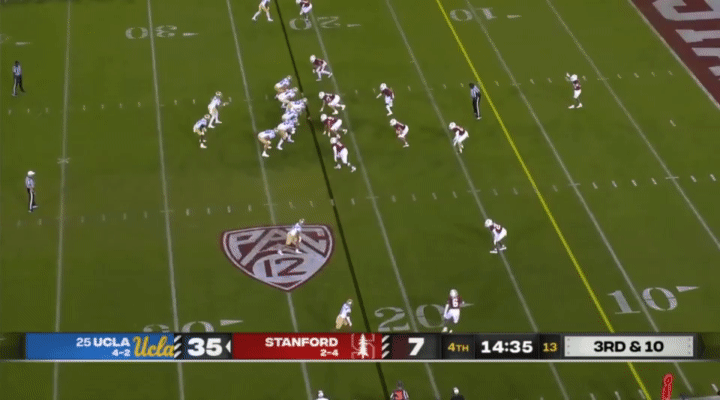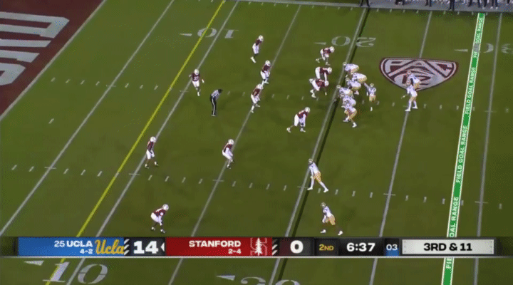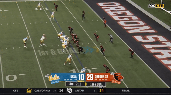 This is a great play call to attack this defense, but BOGO Garbers needs to throw this one earlier, as the late throw made the throwing window too small for him to hit. It’s the kind of play you can imagine a quarterback making if he were given more time in the offense to properly develop (quicker reads, trust your instincts, etc), but Garbers has only sporadically started during his time at UCLA and hence why I think his development has been stunted. This is a common theme for UCLA players, as you’ll see in a bit.