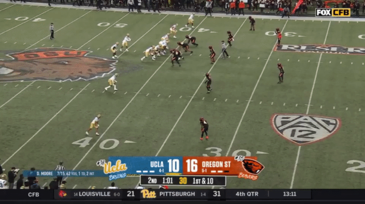 Let’s get Collin Schlee out of the way first. He’s not quite a “backup” quarterback and more of a situational/gadget-type player for UCLA, similar to the way Stanford likes to use QB Justin Lamson (typically, in obvious running situations). He did start one game this year due to injuries—meaning, he played like a regular quarterback—an ugly 17-7 loss to a bad ASU team. There were no obvious highlights or lowlights to include here (Schlee went 11/18 with 117 yards passing and 51 yards rushing), but there were just a lot of plays like this, where Schlee clearly doesn’t have the same level of chemistry with the receivers on e.g. timing routes: