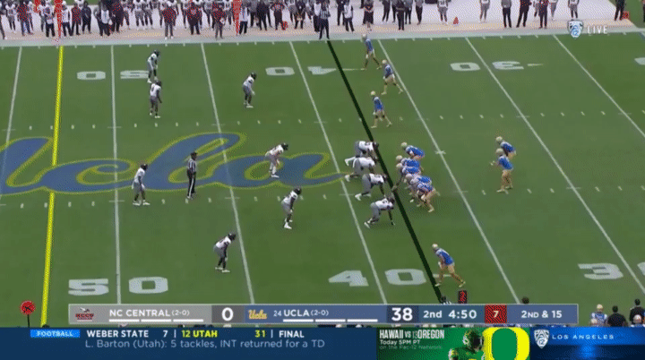 The next play is less of a highlight by WR Josiah Norwood and more so emblematic of the UCLA offense, in which the defense keys in on the UCLA run game, and UCLA takes advantage of that with play-action to hit a receiver behind the defense: