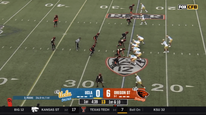Back to the subject at hand, UCLA will find ways to get TE Moliki Matavao involved in the passing game, usually by using him to run block often before eventually having him leak out into open space to be a big pass-catching target. Here’s the same passing concept we saw on an earlier Garbers throw, and although OSU unsurprisingly defends it better than Colorado did, Matavao gets open and bounces off a tackle to pick up a couple extra yards: