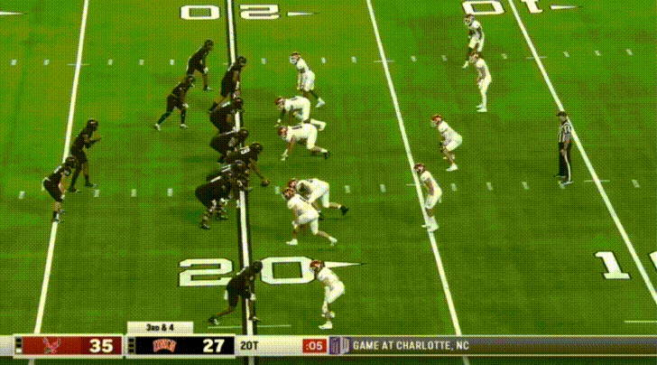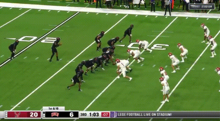 Here it looks like the left tackle Daviyon McDaniel—a name I noticed a lot—simply doesn’t see the edge rusher on a 3 man rush:
