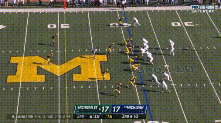 With the game on the line, the offensive line came up short in the following play. It’s a 5-man rush against 5 in protection, so it’s on the quarterback to shift his protection (or at least be aware of the unblocked rusher) here, but he was likely more preoccupied with the clock in this situation: