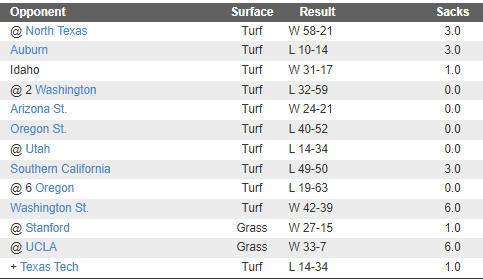 Six sacks in the first two games, albeit against G5 competition/a broken Auburn offense.