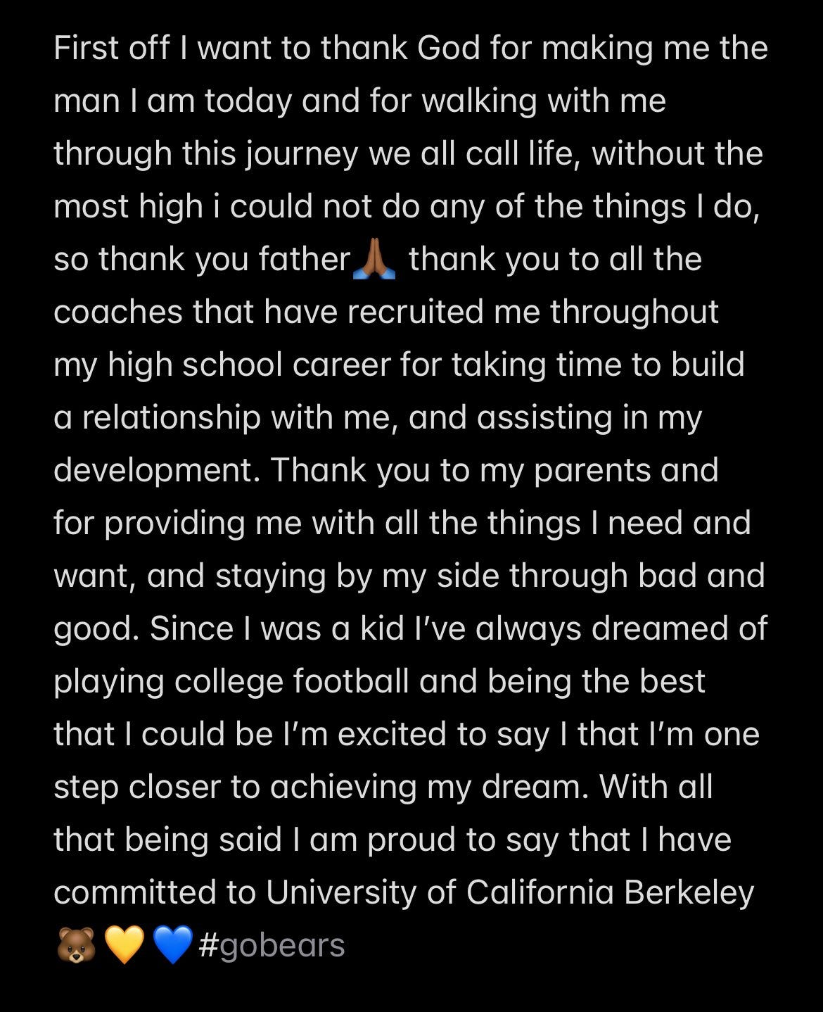 "My visit was great. I love the scenery of the California and the campus and the facility it was a great vibe the coaches are very together and all think alike! This coaching staff has been recruiting me for about two years now and I’m really grateful for their consistency. Also my ability to play as a freshman also peaks my interest because I do wanna make an impact as soon as I step on campus. And with Coach Bloesch being the OC is a plus he has a good relationship with my high school coach! Coach Toler as well he’s been very consistent with me and continues to be the same way he was two years ago!"