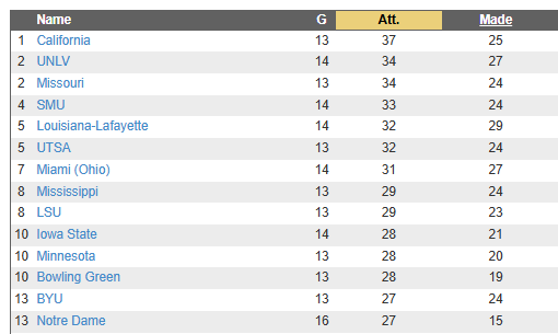 But rather than focusing on the often razor-thin margin between a made kick and a missed kick, I’d like to focus on a different stat. Here’s a clip of the team rankings for field goals attempted: