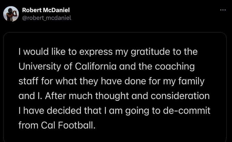 The California Golden Bears will likely have to find a new quarterback for the 2025 recruiting class, as Robert McDaniel has reopened his recruitment.