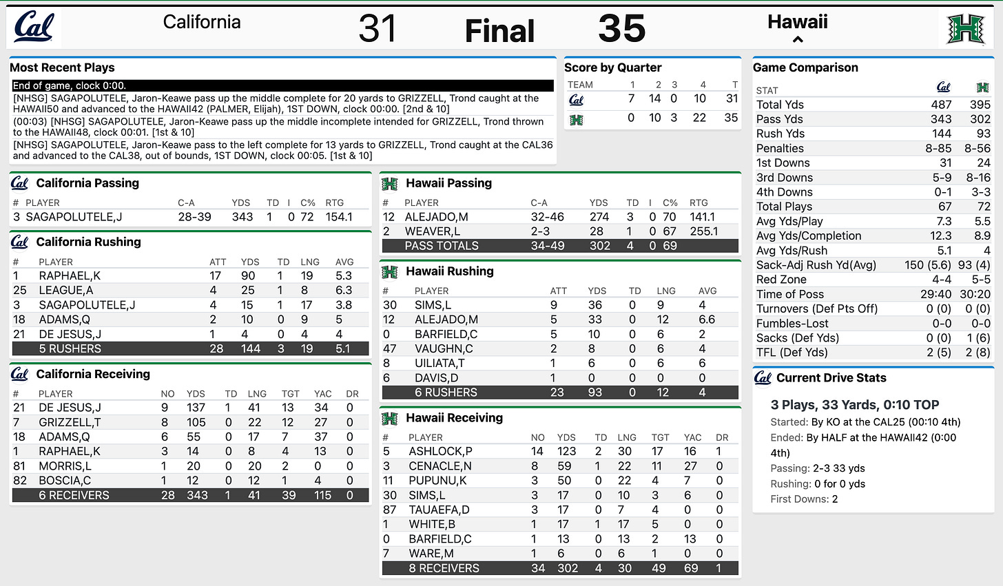 2025 Sheraton Hawai'i Bowl: Cal v. Hawaii Live Fan Chat & Game Thread - Bears Lose 31-35Write For California StaffDec 24, 20258449ShareLeave a commentHow to watch the 2025 Sheraton Hawai’i Bowl: Cal v. Hawaii college footballWhen: Wednesday, Dec. 24, 2025Kick-Off Time: 5 p.m. PacificWhere: Clarence T.C. Ching Athletics Complex in HonoluluTV: ESPNRadio: KSFO 810 AMSubscribe2025 Sheraton Hawai’i Bowl: Cal v. Hawaii college football full-game statsPreviousNext