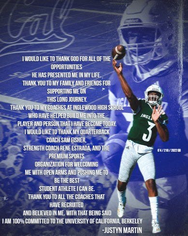 Justyn Martin, a 6’4, 210 lbs quarterback from Inglewood, California, has announced his commitment to the California Golden Bears. Martin’s verbal commitment is the second the Bears have received in the 2022 recruiting class after Damonic Williams, a 4-star defensive tackle, became the first.