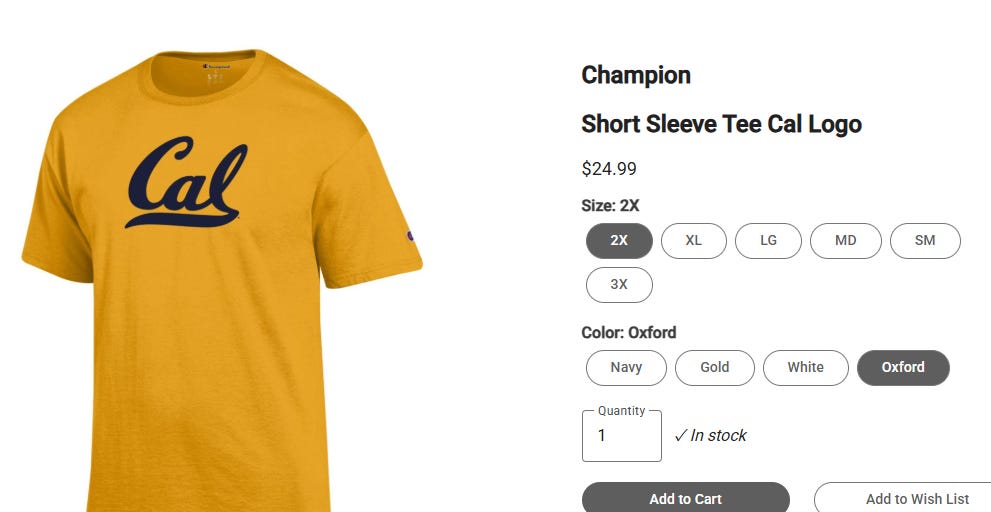 Yours truly will be at the game Saturday wearing my gold Oski Wow-Wow shirt from Homefield Apparel, the most perfect Oski shirt to ever exist. Homefield also carries a Golden Bear Roth Helmet T-Shirt that looks pretty dapper. Again, probably not going to get here by Saturday, but you know what, get it now in anticipation of the next Gold Out!