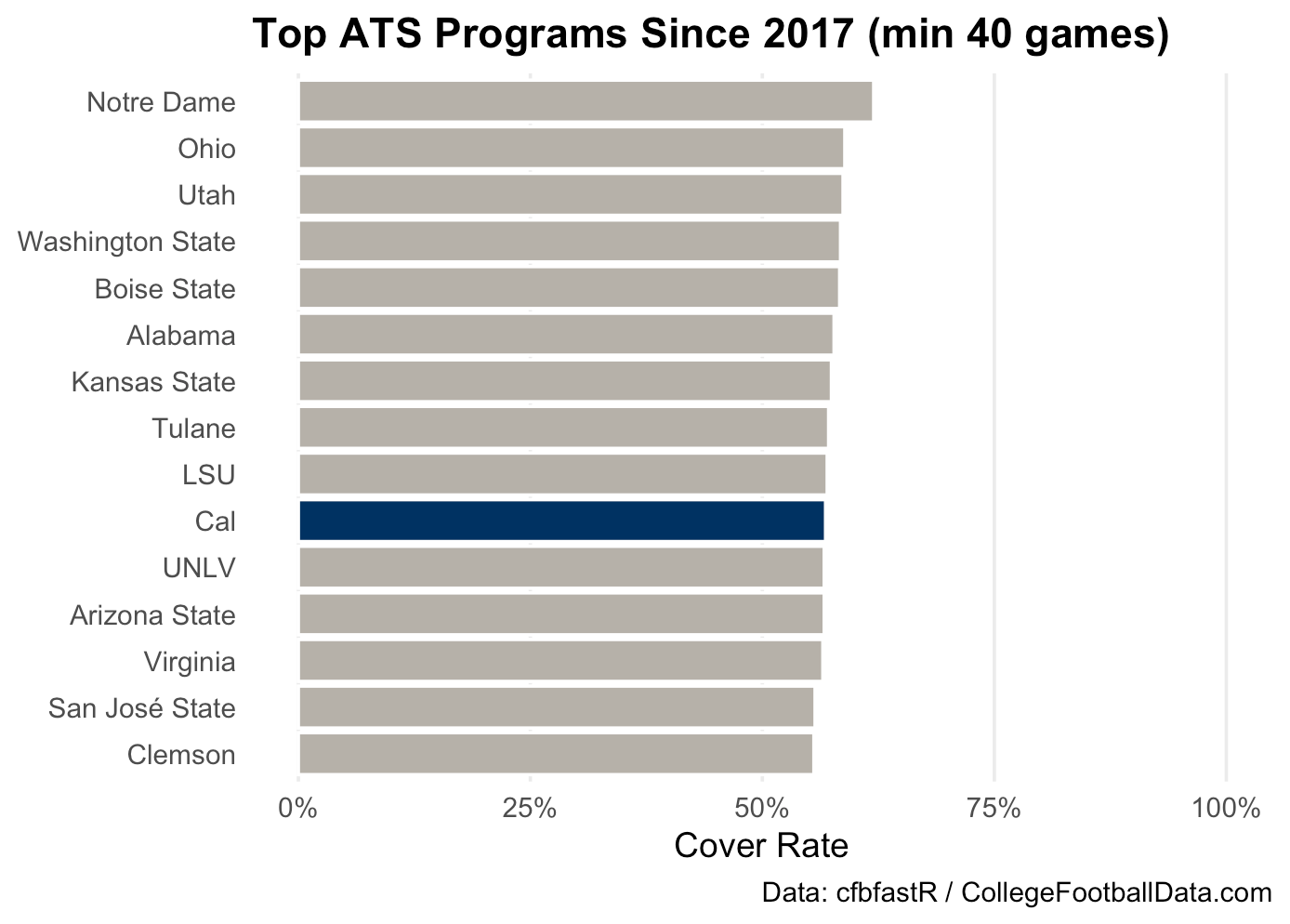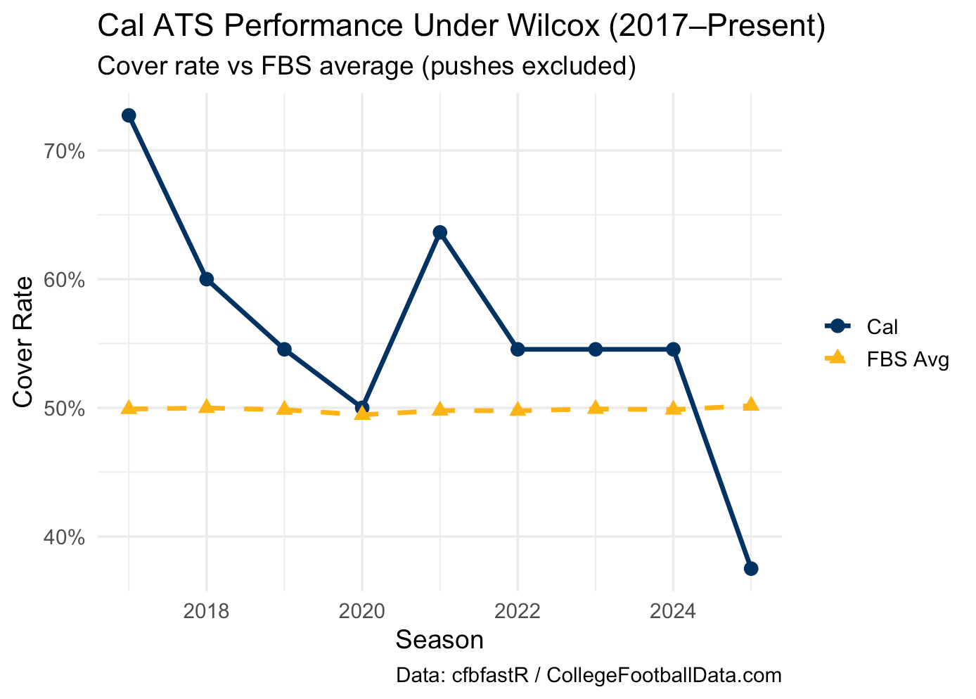 Compared to the rest of FBS, the Bears have a relatively high cover rate. Call it the Wilcox paradox: a program steady enough to stay in most games, yet unpredictable enough to turn would-be blow outs into close calls.