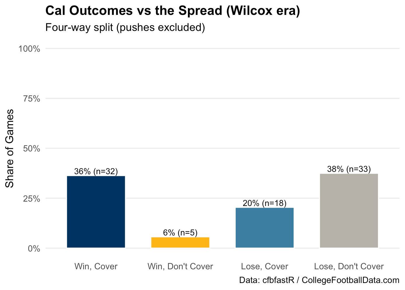 Since 2017, Cal has been a riddle. They’ve covered much more than they’ve won: 56% of the time against the spread, compared to 46% win rate. As the plot below shows, about a third of Cal’s games fall into the “win and cover” sweet spot. Another fifth? Losses that manage to exceed expectations—a testament to defensive grit.