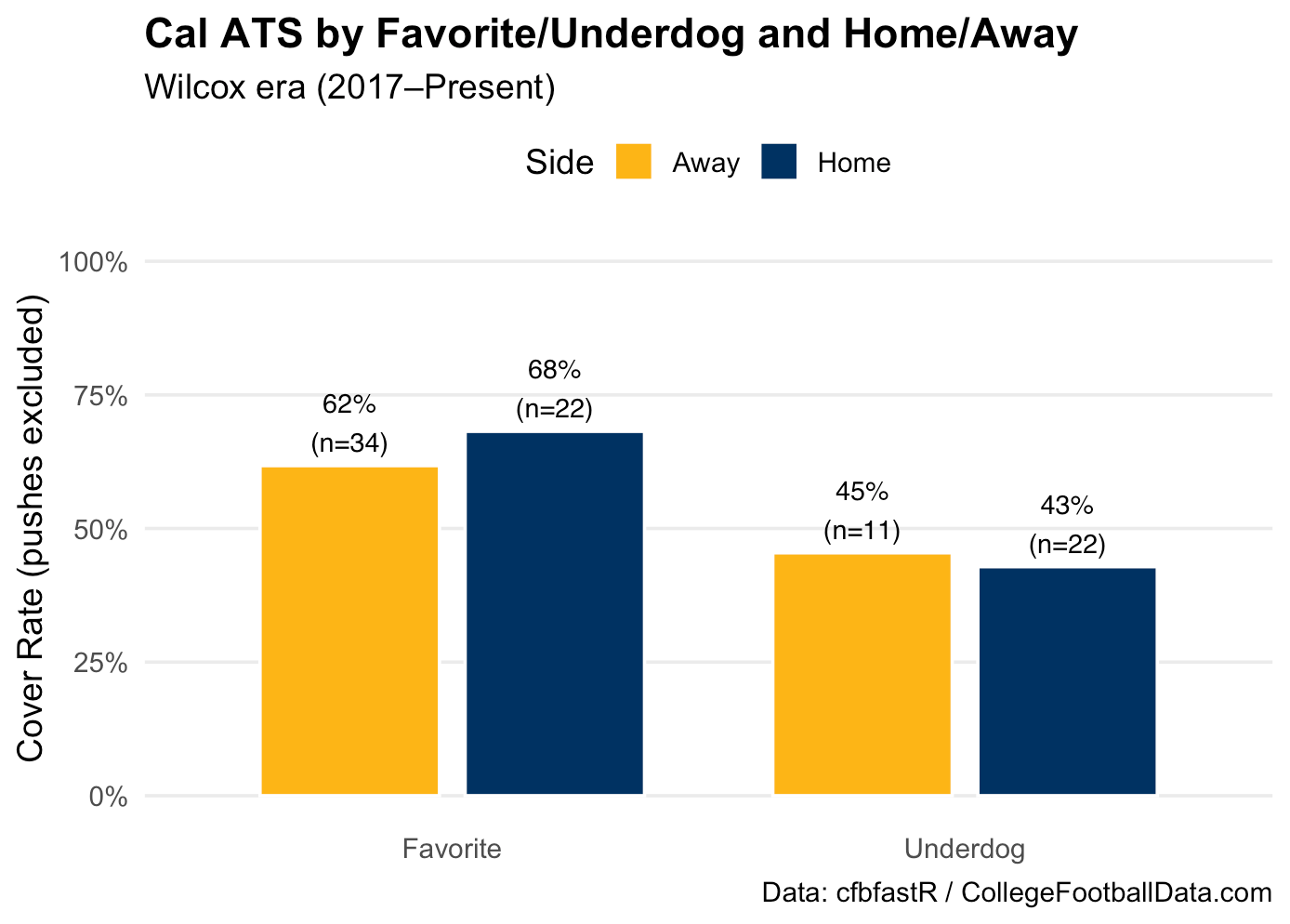When favored, Cal covers more often than not—about two-thirds of the time at home. But as underdogs, they revert back to coin-flip territory and their homefield advantage seems to evaporate. Perhaps it’s a reminder that the team feeds off energy as much as talent and that a Memorial Stadium could use a little more of it when the odds are stacked against the Bears.