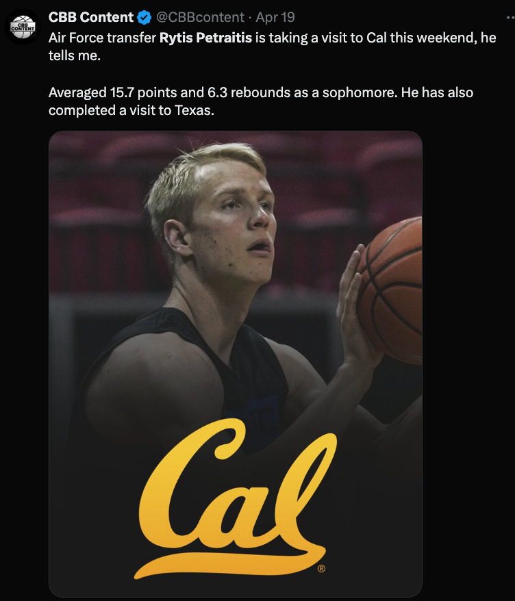 Air Force transfer forward Rytis Petraitis reportedly visiting Cal this weekend