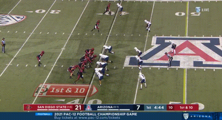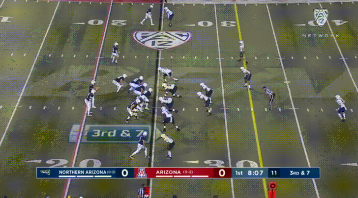 This last play is a good example of how well Arizona can disguise pressure. Watching it quickly, can you tell which positions rushed and which showed blitz before dropping back? If it takes you a couple loops to figure it out, imagine how hard it is for the quarterback and offensive linemen who only have a split second to determine their blocking responsibilities. Here, the Northern Arizona offensive line is fooled into leaving the nose tackle unblocked: