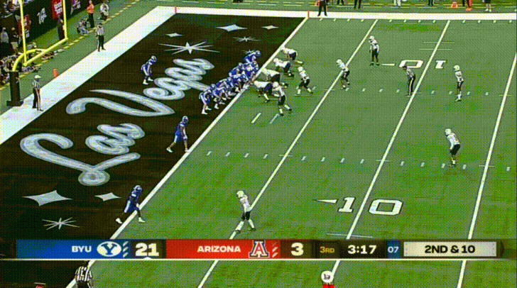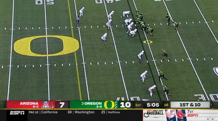 The defensive line is obviously the strength of this defense, with an emphasis on the pass rush. Watch as the entire Arizona defensive line manhandles the Oregon offensive line, as even the mobile QB Anthony Brown could not escape the collapsing pocket: