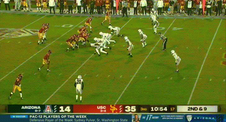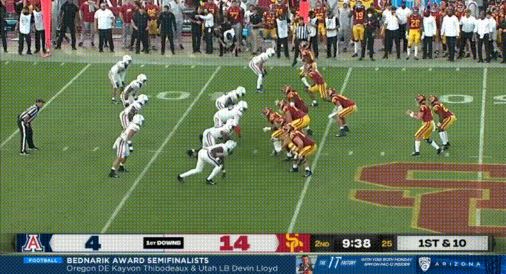Another surprise this year is freshman defensive tackle Paris Shand. Shand has taken a couple snaps all along the defensive line in relief of other players, but he had a larger role last week against USC and made a noticeable impact in generating pressure. Here Shand lines up at defensive end and beats USC’s left tackle for the sack: