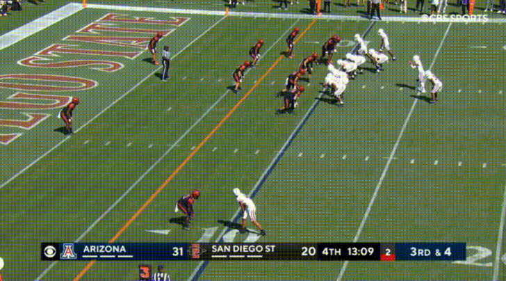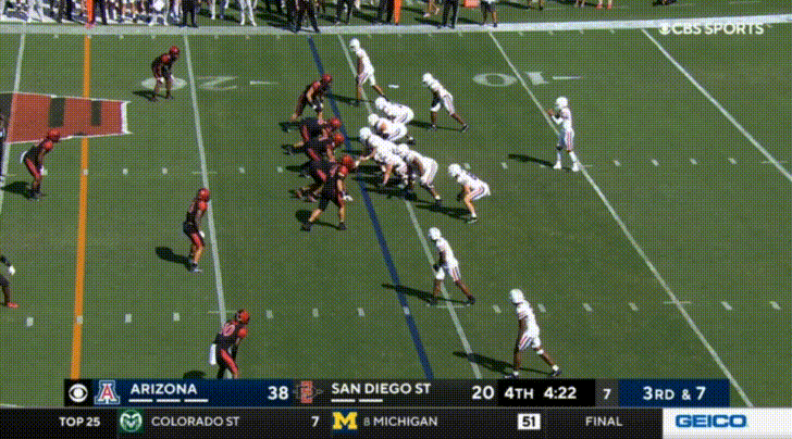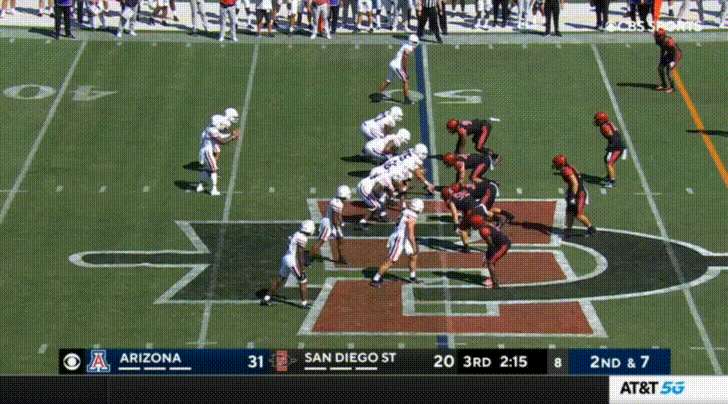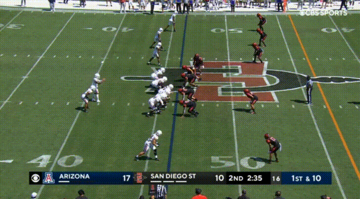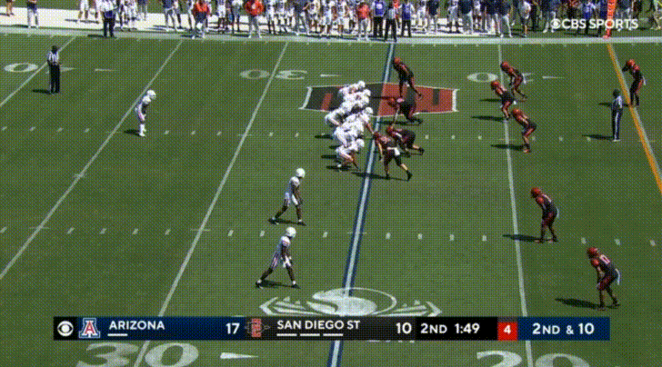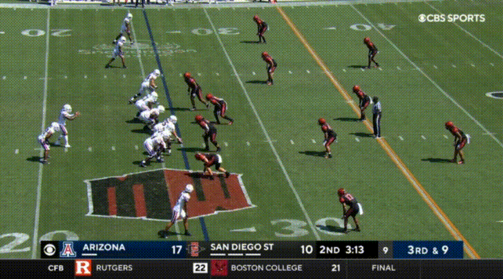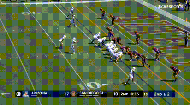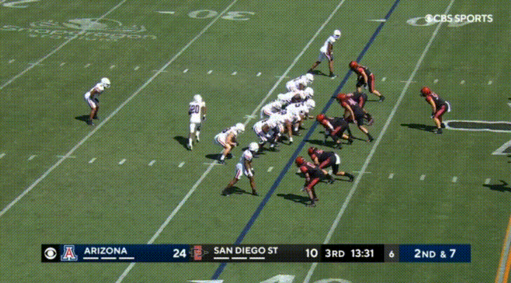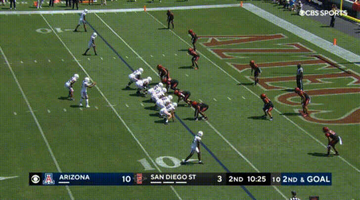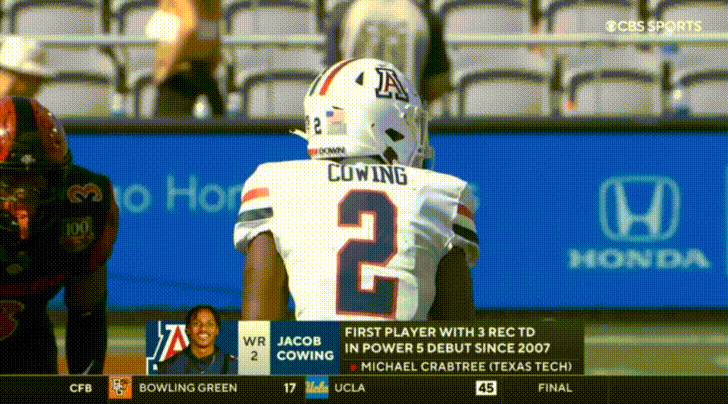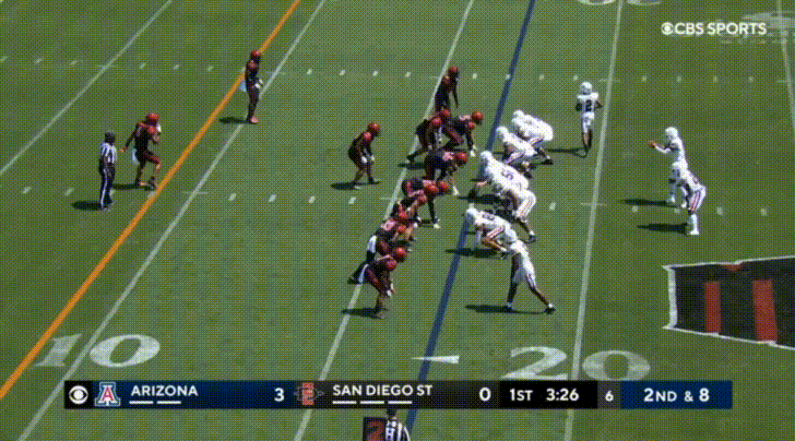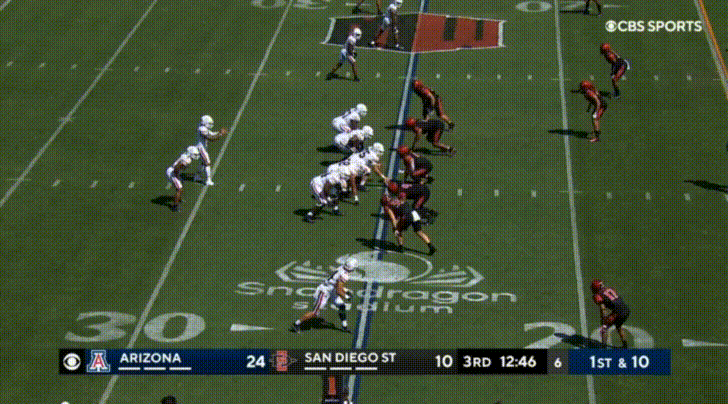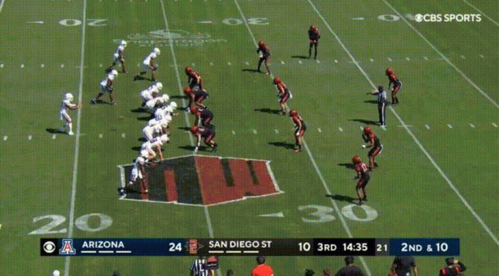 Arizona’s top receiver this season is the transfer from UTEP, Jacob Cowing. Cowing’s most obvious attributes are his speed and route-running abilities. Cowing repeatedly burned San Diego State:
