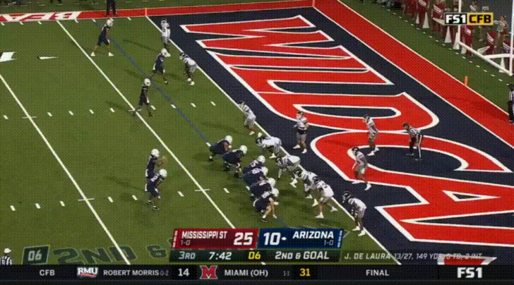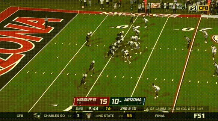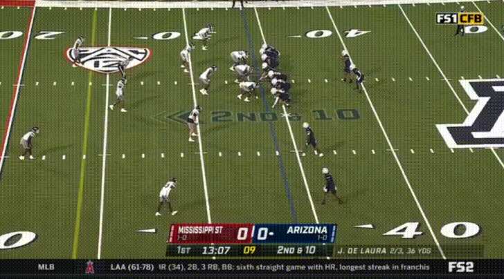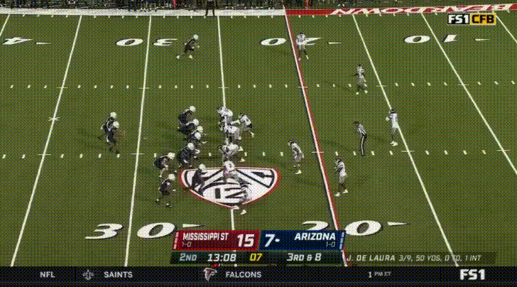 De Laura absolutely loves this sort of 50/50 throw (which is obviously less than 50/50 if your receiver doesn’t see it coming), and very often throws questionable passes up to his receivers with the expectation that they’ll out-muscle the defensive back for the catch. As someone who was in Notre Dame’s stadium last week just praying that QB Drew Pyne would try to take a shot down the field so that the Cal secondary could capitalize, I hope de Laura has this same sort of overconfidence against the Cal secondary. Against Mississippi State, this misguided overconfidence resulted in 3 interceptions.