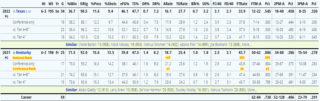 You can see flashes of a 4 star player: a solid assist rate as a true freshman that improved as the year went along. A solid free throw rate, which suggests he’s able to beat defenders and get to the bucket. He was in the rotation for two high-end defenses and he has a good steal rate, so he’s probably a plus defender.