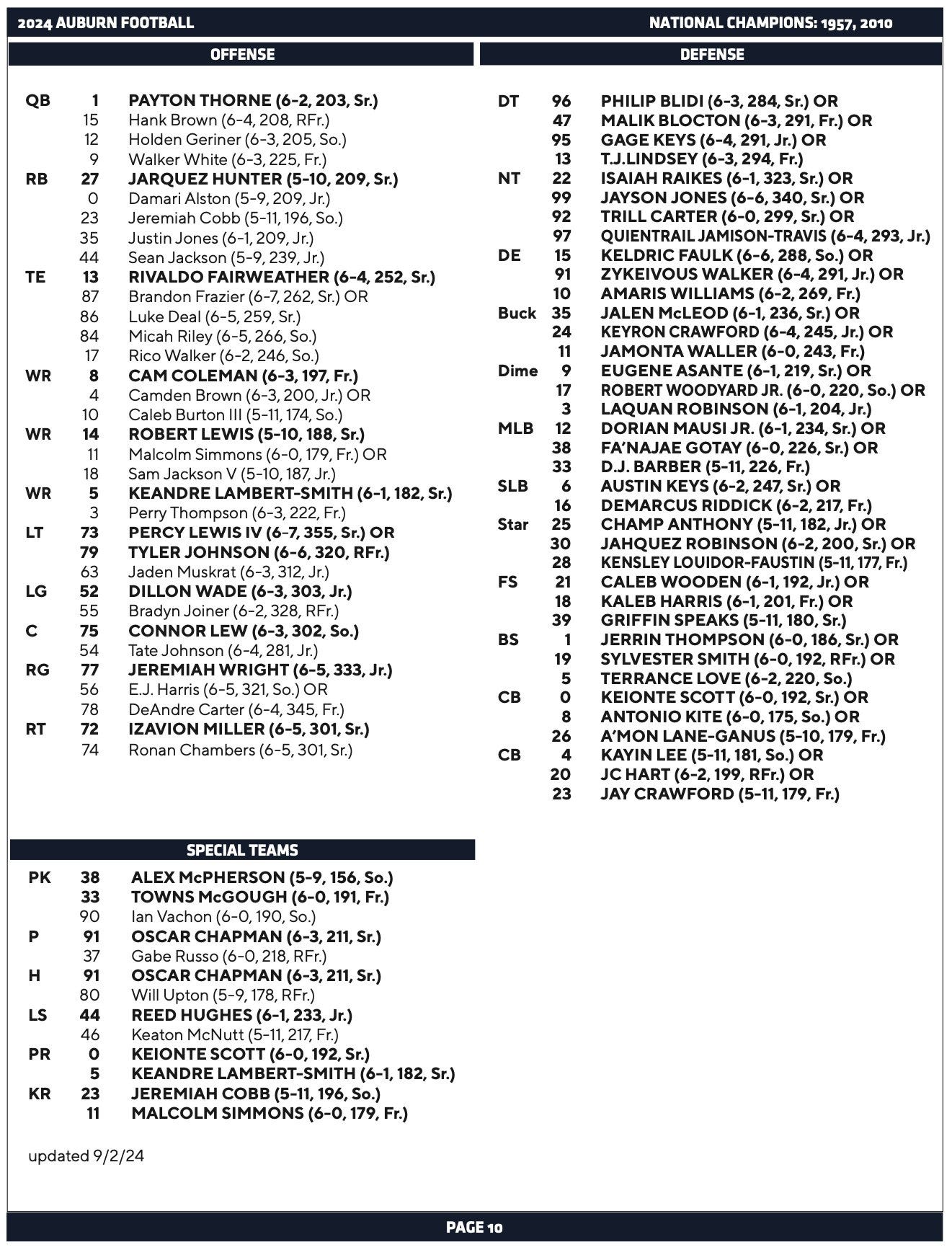This is one of the more unique depth charts that I’ve come across when looking over teams. All defensive starts are listed with an OR on the depth chart. Of course these aren’t meant to be gospel but it does showcase both on paper and on the field that Hugh Freeze and DJ Durkin are willing to rotate a lot of players. In particular, Auburn will rotate heavily on the defensive line, with a mix of young players and veterans coming into the fold and both adjusting to the college game along with the Alabama heat.