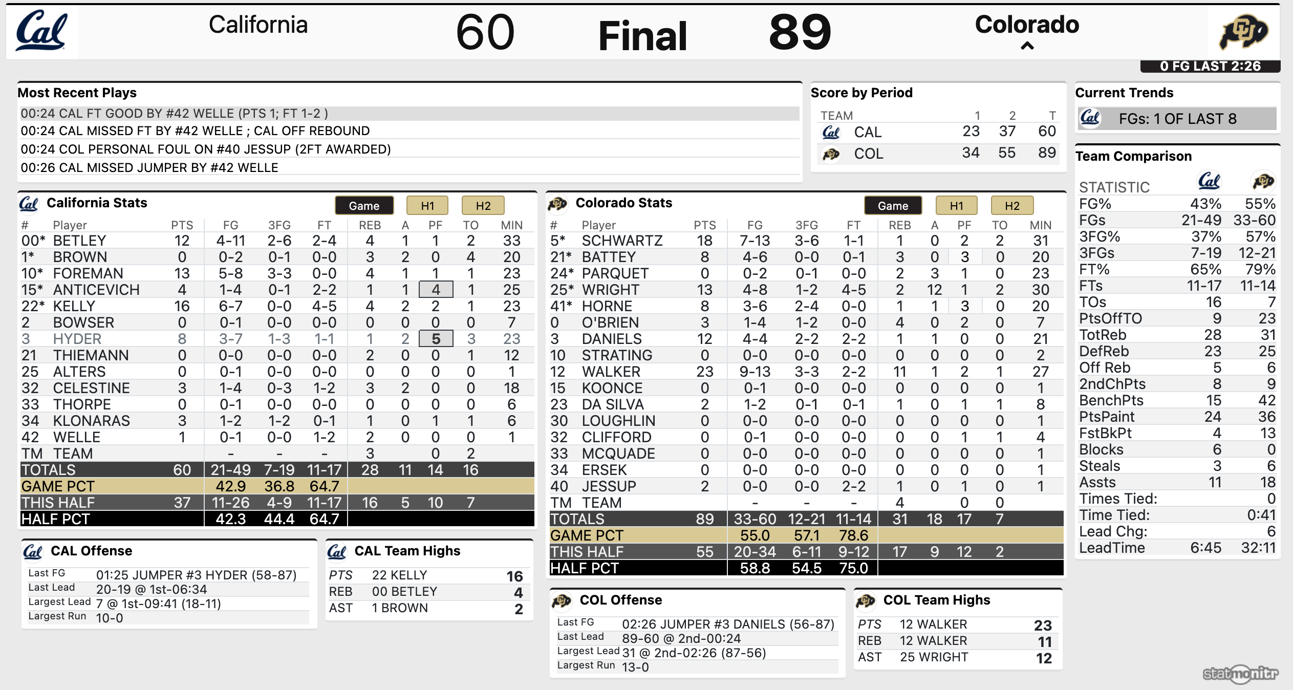 I only got to tune in to watch parts of this one, but I think McKinley Wright looked very good and was responsible for how efficient the Colorado offense was against the Bears. Cal somehow managed to make some shots and made some defensive stops (Lars got 3 blocks in this one, Kelly had 2) to win the 1/3 mark of the game, then everything fell apart just before the half, probably due to the much better depth for Colorado. The tough schedule for the rest of January continues, and I don't think no news is good news as for Matt Bradley's availability.