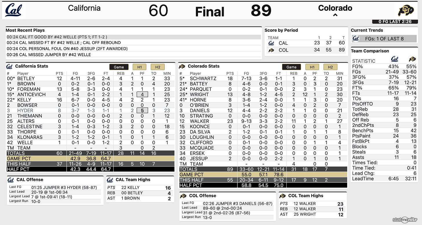 The Bears fell right back into the loss column after an 89-60 loss against Colorado. The end result was somewhat expected. KenPom gave Cal a 9% chance of winning against its 14th ranked team, and for reference, the Bears are ranked 153th. Despite the expectation, it was still a deflating loss, albeit against a very good Colorado team, and even more so because of the method in which the Bears lost.
