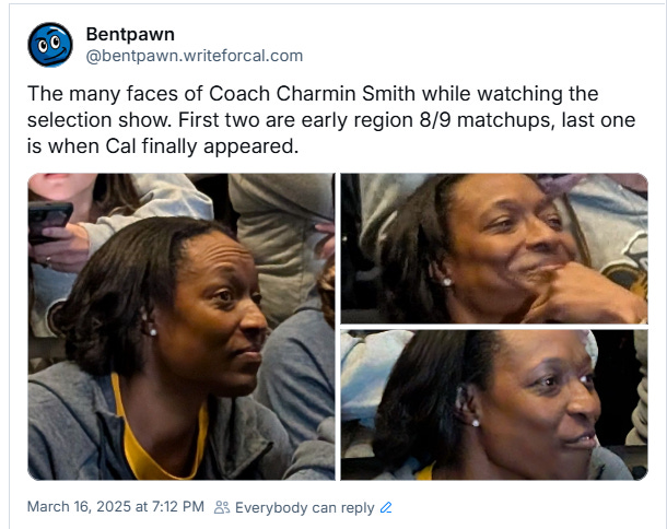 On Selection Sunday, the Cal Women’s Basketball Team had to sit through 40 minutes of coverage of the first three regions, 50 teams total, in anxious anticipation of Cal’s placement in the bracket. Coach Smith had been talking the last few weeks about avoiding the 8/9 line. Georgia Tech was the first ACC team called, earning a 9-seed in the same subregion as overall #1 seed UCLA. Tech finished 8th in the conference, right behind Cal, though their NET and several other metrics were ahead of Cal. Heading into the last region, seven other ACC schools had been announced, with Louisville (6th in conference just ahead of Cal) earning a 7 seed. It was easy to predict Cal would fall on the 8-line.