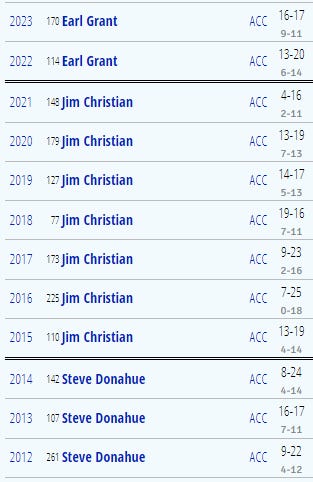 To be fair, Earl Grant has BC slowly improving and the Eagles managed 20 wins for the first time since 2011 this past season. On the downside, their best player is out of eligibility and five dudes are in the portal so it’s probably the start of another rebuild on Chestnut Hill.