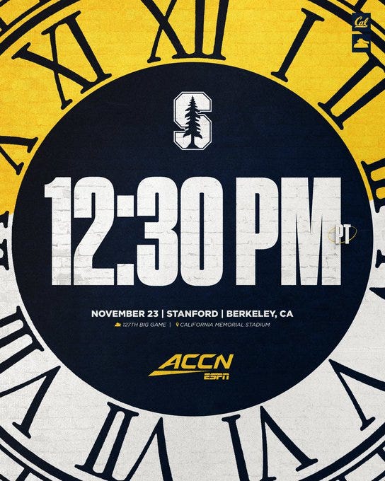 The 127th Big Game between Cal v. Stanford will be an afternoon game