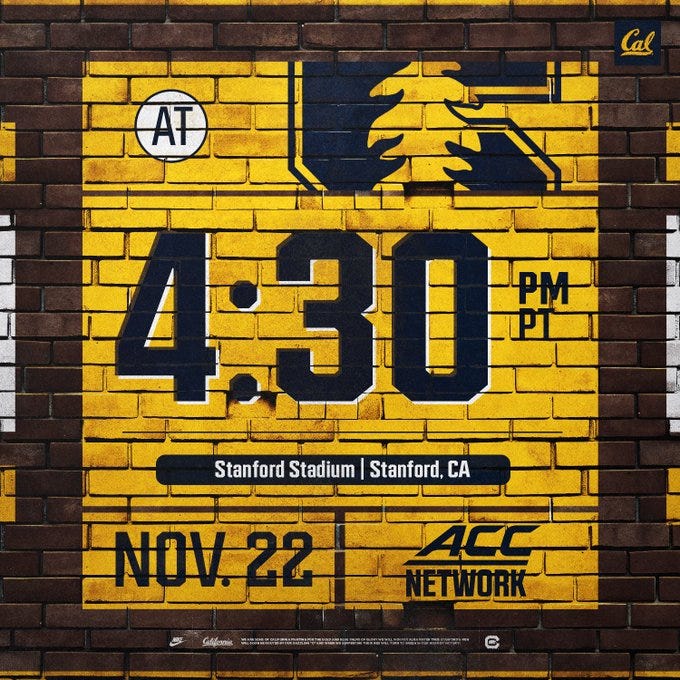 The 128th Big Game between the California Golden Bears (6-4, 3-3 ACC) and the Stanford Cardinal (3-7, 2-5 ACC) will kick off on Saturday, Nov. 22, at 4:30 p.m. Pacific, according to announcements from Cal Athletics and the Atlantic Coast Conference Monday morning.
