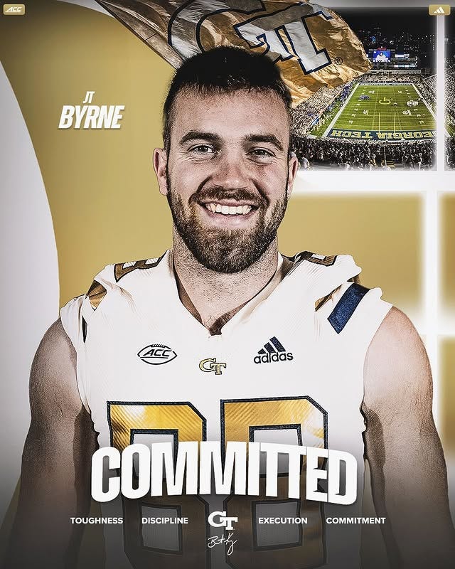 Tight end J.T. Byrne is staying in the ACC, heading east to Georgia Tech.