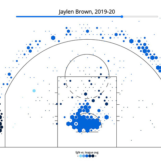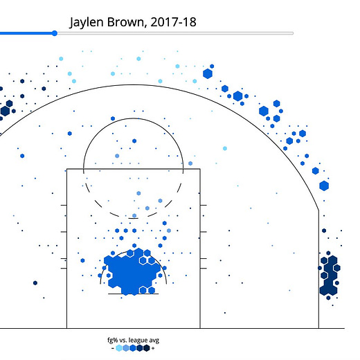 Check out Jaylen Brown’s shot charts (regular season only) from 2017 to 2021 from StatMuse.