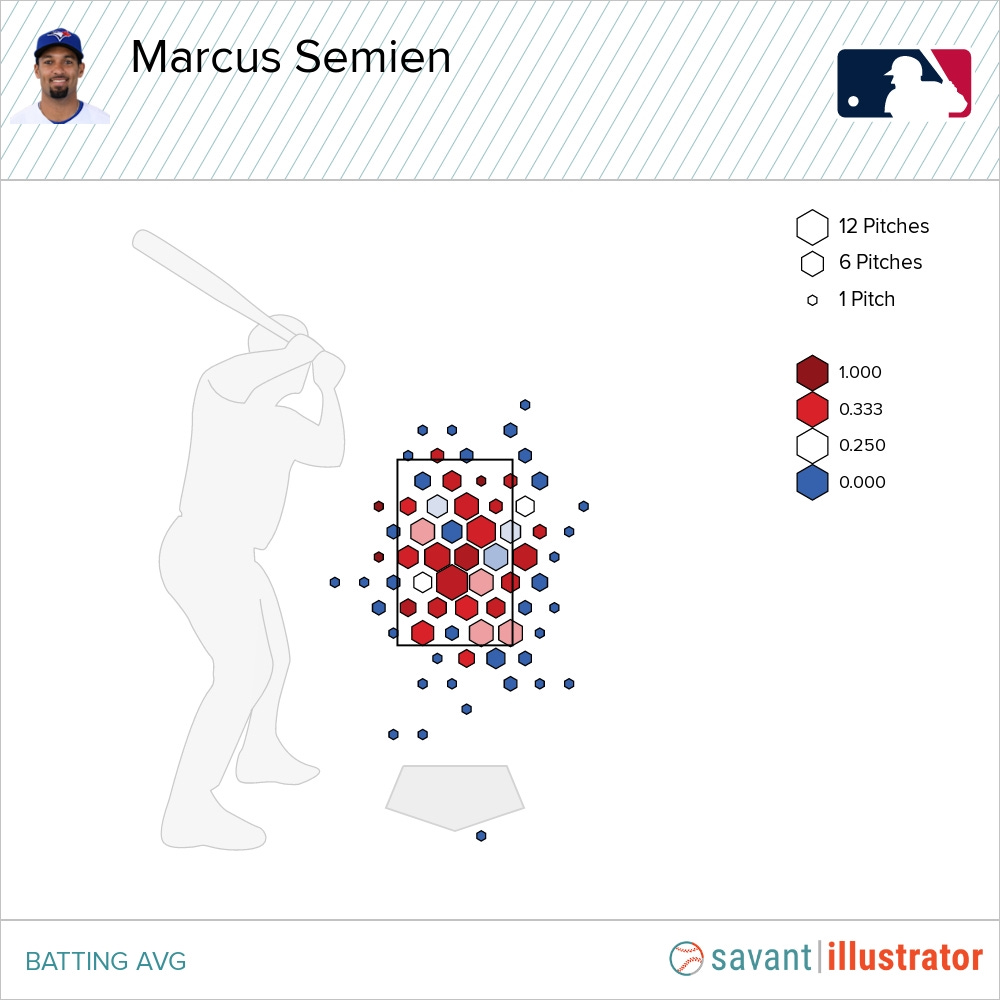 Simply put, Semien achieved his great May by not missing on the pitches in the middle of the strike zone. Semien hit 8 home runs in the month and nearly hit for the cycle in a game (he was a single short).