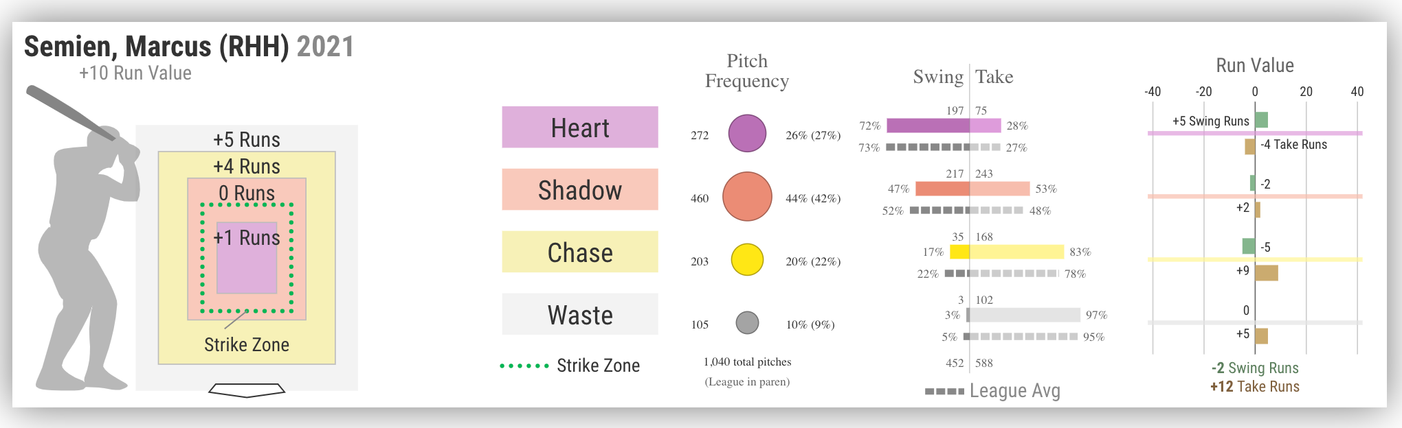 Semien also did a great job of not chasing the pitches outside the strike zone to post a 0.429 OBP as the leadoff batter. Baseball Savant’s Swing-Take breakdown credits him with +9 Run in value earned from taking all those balls.