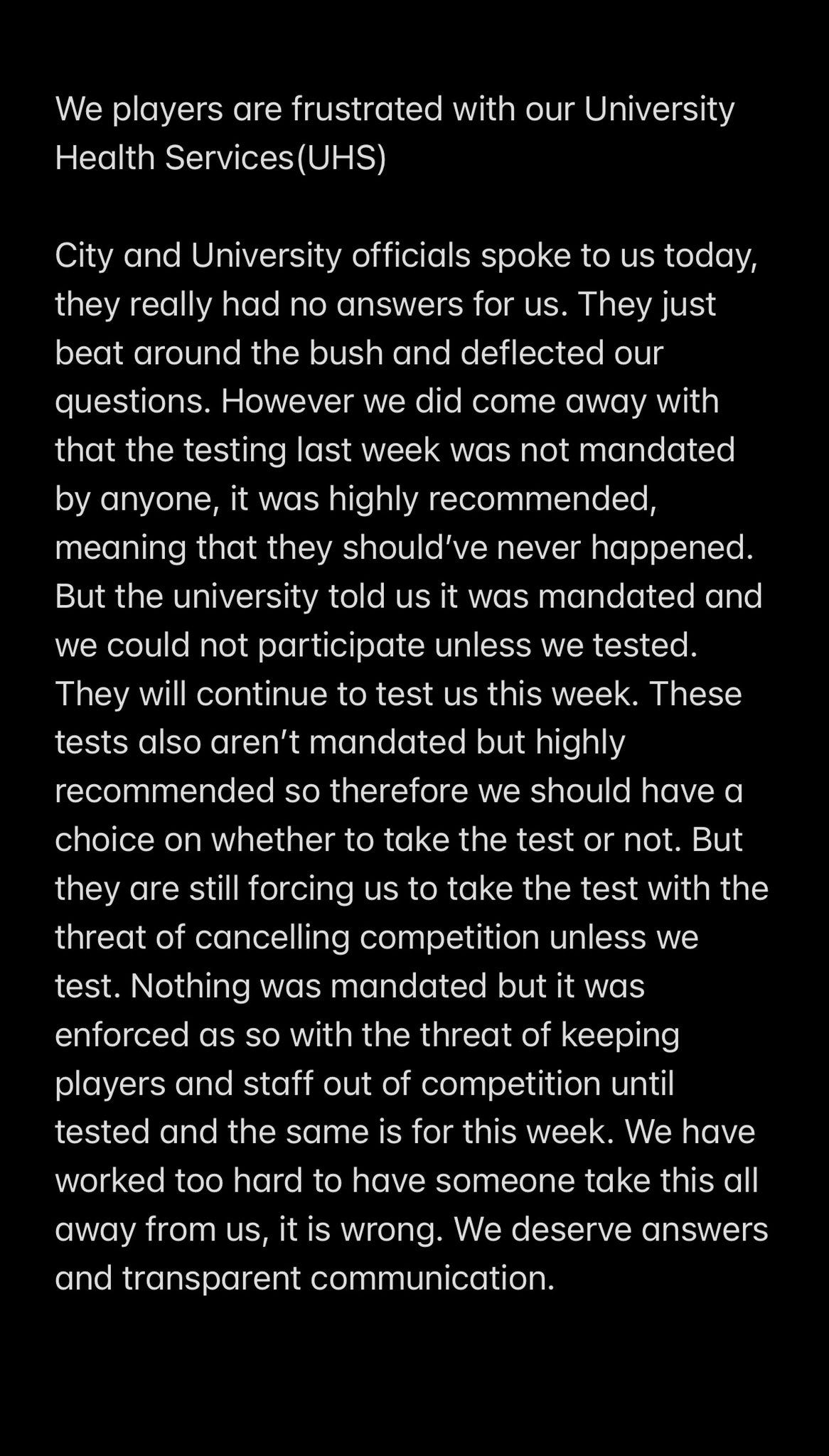 He added, “it was highly recommended, meaning that they [the COVID-19 testing] should’ve never happened. But the university told us it was mandated and we could not participate unless we tested.”
