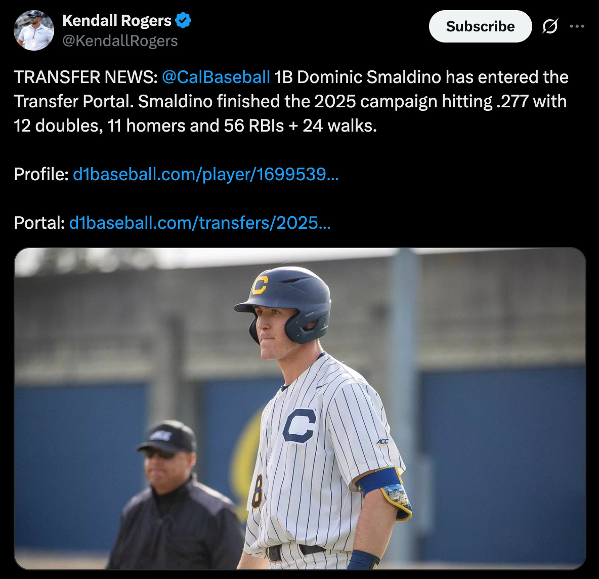 Smaldino enters the portal, coming into his junior season (first reported by Kendall Rogers via X/D1Baseball). At the same time, Cal will look to backfill ANOTHER huge hole left by a core infielder’s departure from the program. The Golden Bears currently have no backup first baseman on the roster, but will have four incoming freshmen from the graduating class of 2025 who list 1B as a backup position in their recruitment profiles (via Perfect Game).