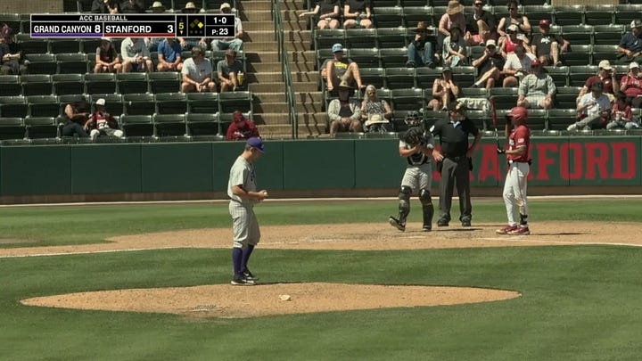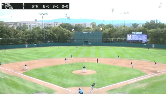 Stanford’s production is a mixed bag. Using two examples here, Stanford has had games where they have used a single behind-the-plate camera to capture the entirety of a 9-inning broadcast with an ugly and outdated score bug, but they have also used the “stock” (not modified) ESPN/ESPN+ score bug with multiple camera angles and an overall higher production effort.