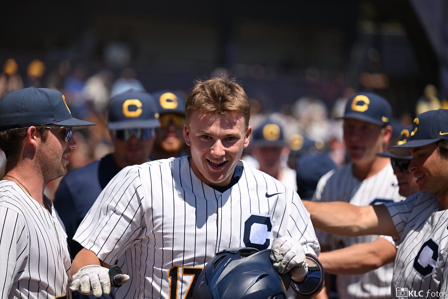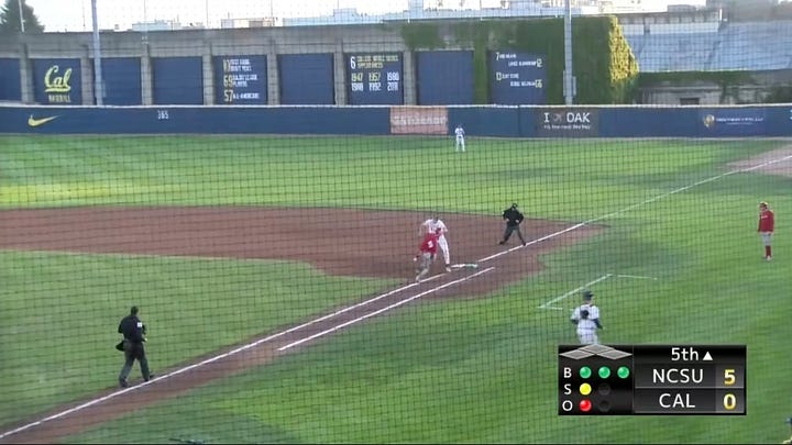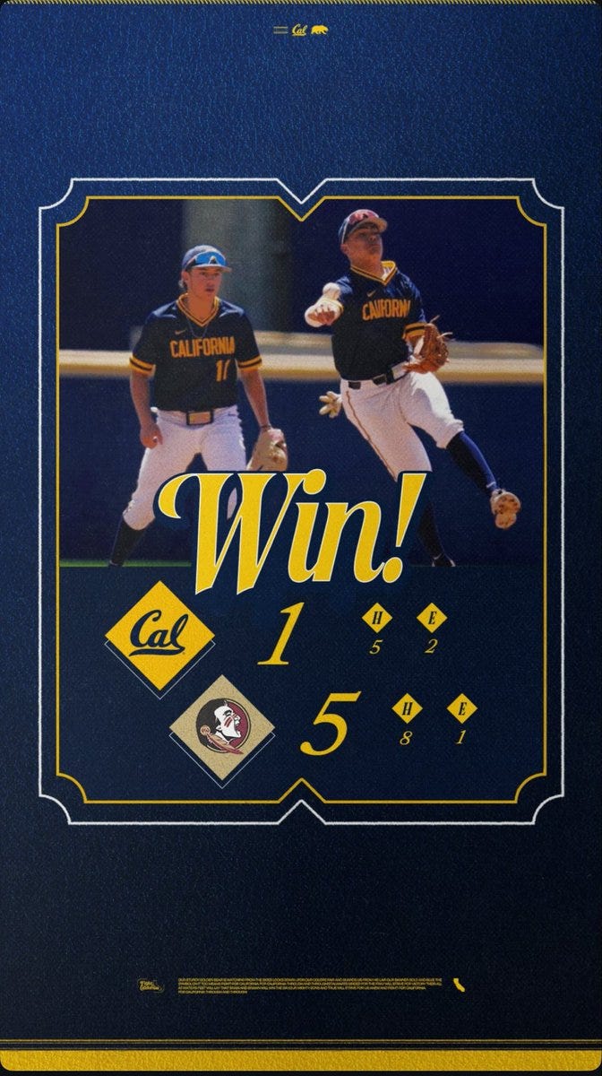 Put yourself in my shoes. Driving northbound on the I-5 from San Diego towards Los Angeles. My partner is asleep next to me. Her sick dogs are in the back, snoring. I knew I was not able to watch game three of the series live, but I figured I would catch it “on demand” through ESPN+ when I was home. My curiosity got the best of me, and I checked Twitter to see the final score, and I saw this posted by Cal Baseball’s official page: