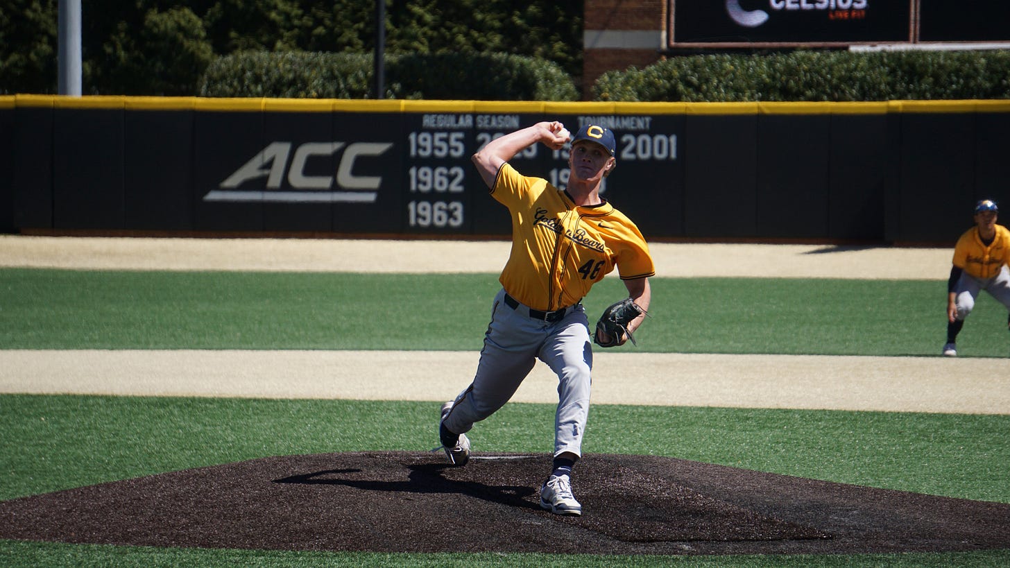 The California Golden Bears returned to action after a week-long rest to travel back across the country and play in a second consecutive East Coast series. Mike Neu and pitching coach Chris Bodishbaugh stuck with the same three-man rotation we have gotten used to this season, with Oliver de la Torre getting the opening nod on Friday night against Sophomore UNC Wilmington transfer Cameron Bagwell.