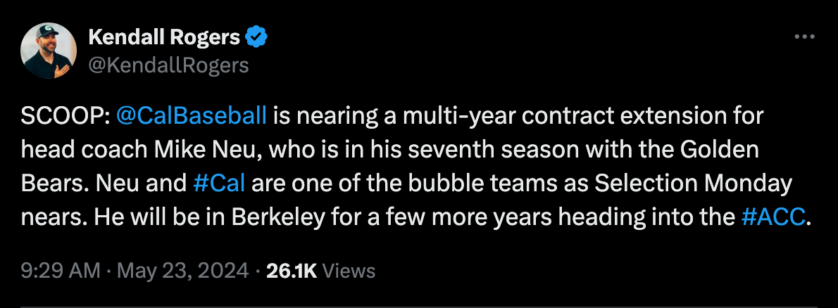 Finally, a scoop from D1Baseball’s Kendall Rogers is that Cal head coach Mike Neu is about to get an extension. This year’s successful season (even if it somehow ends tonight) is certainly a good justification for this move.