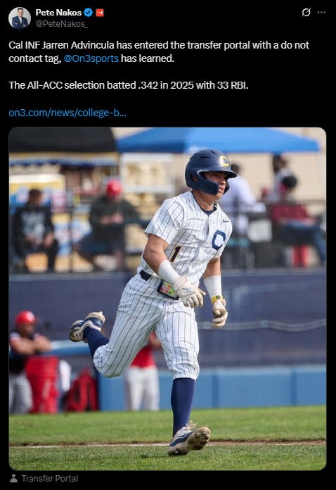 Cal's .342 hitter has entered the transfer portal with a "do not contact" tag after the Bears' first season in the ACC. (First reported via Pete Nakos on X)