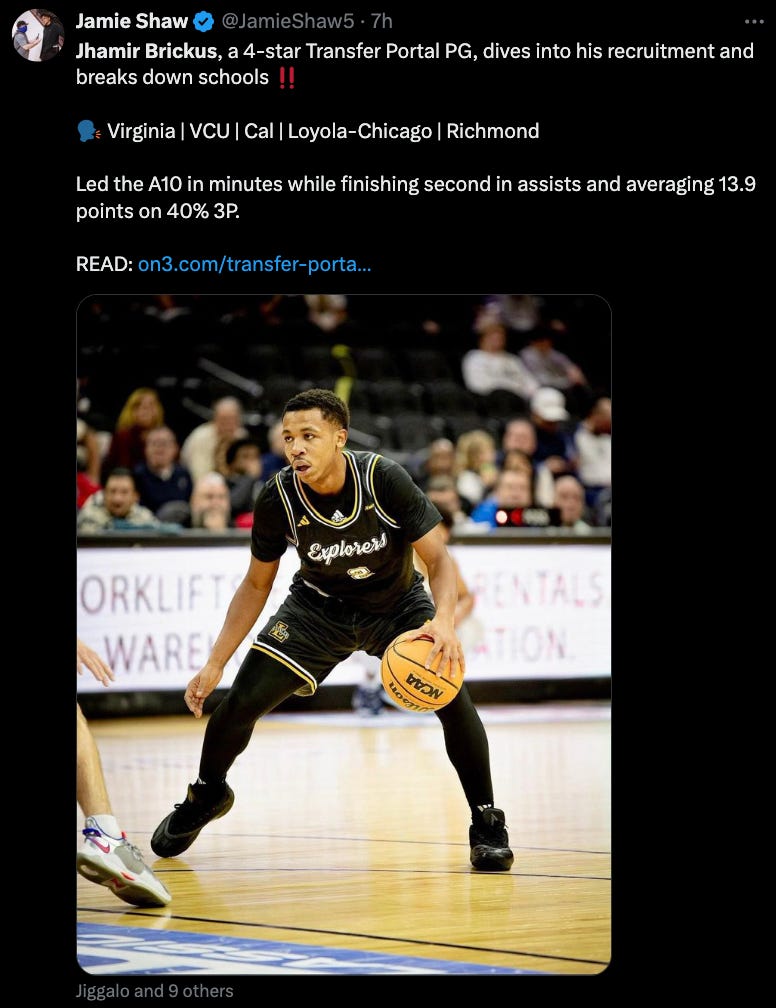 La Salle transfer guard Jhamir Brickus has a top five of Virginia, VCU, Cal, Loyola-Chicago, and Richmond. Brickus led the Atlantic 10 in minutes while finishing second in assists and averaging 13.9 points on 40% three-point shooting.
