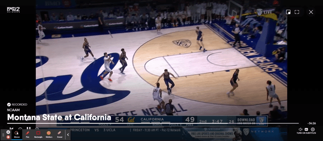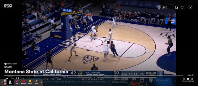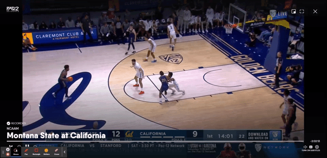 Montana State’s Brandon Walker was a dominant force Thursday night. He scored 28 points on 11-of-21 shooting, showing an impressive array of footwork and spins that Cal could not cover. Many of his plays started outside, where he would get a high screen and gain momentum going to the basket. Here’s a play where he drives, and spins on Aimaq to get the basket and draw a foul.