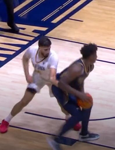 Grant had three sequences on Thursday where he starts on the outside and has an advantage on his defender. He initiates by driving to the key, and the defense responds well. Those three plays resulted in 2 turnovers and 1 offensive foul on Newell. In the clip below, the defender moves laterally enough to never give Newell the corner. Newell tries to force a shot, but ends up with a travel call.