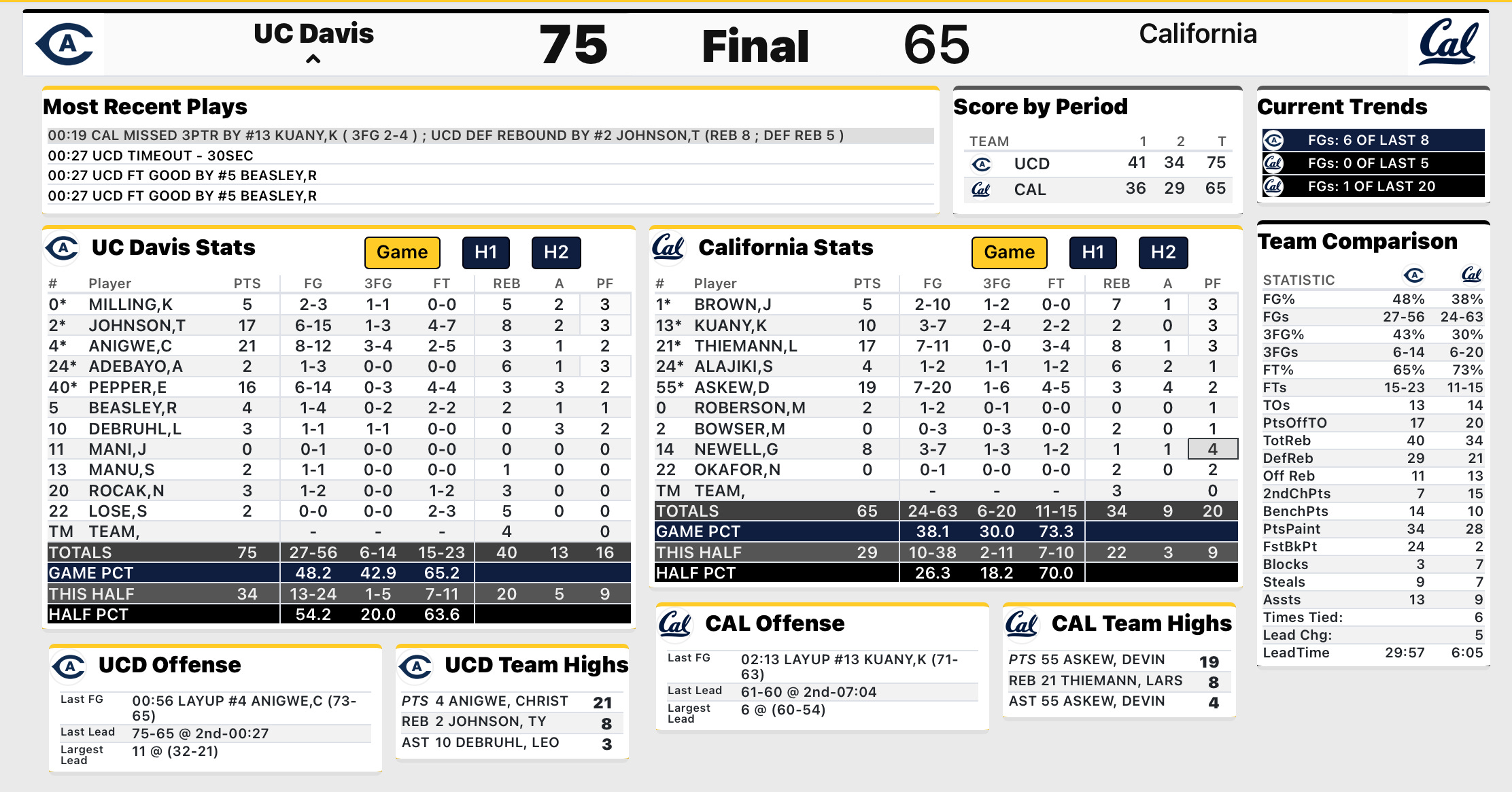 Yes, Pepper sounds like a solid guard and Kristine Anigwe's brother, Christian, is a good inside scorer for the Aggies. However, their 3pt percentage was only slightly better than Cal's last season. They do, however have a few new faces, most notably Robby Beasley, a guard transfer and double digit scorer from Montana and a native of Berkeley. And, if you think Cal plays slow, watch the snail's pace UCD will utilize. You may want an espresso if you plan to make it through this one. And actually I predict Cal will play faster this season than previously as we will have more athletes on the floor. Maybe a decaf.