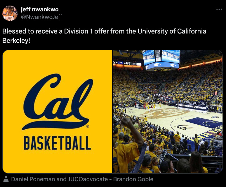 JUCO prospect Jeff Nwankwo has received a recent offer from Cal, as well as Colorado, Arkansas, Ole Miss, LSU, Arizona State. Nwankwo has been ranked as the 7th best JUCO prospect by JUCO Recruiting. A member of the Cowley College Tigers, he was MVP of the Jayhawk Conference as well as 1st Team All-KJCCC.
