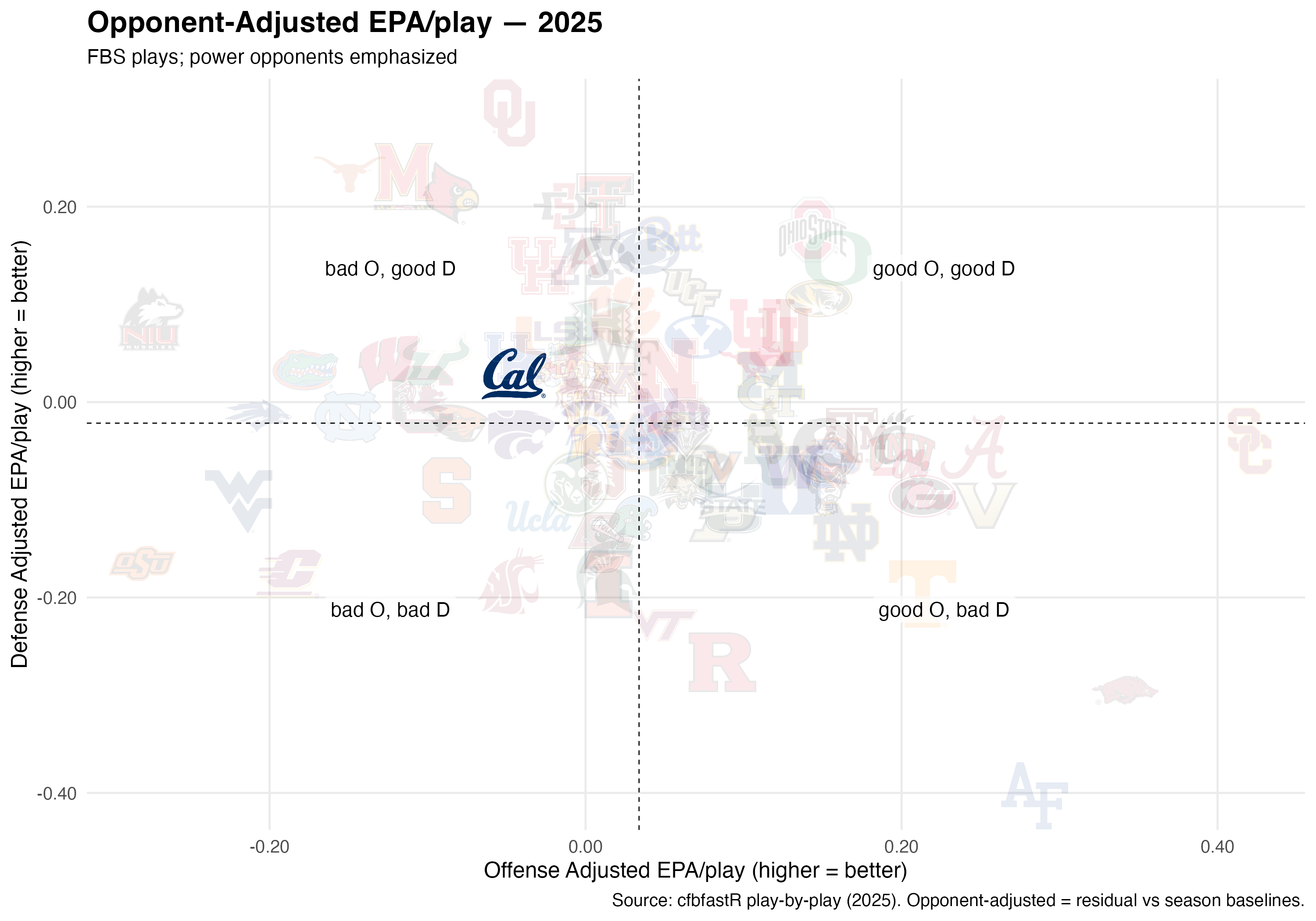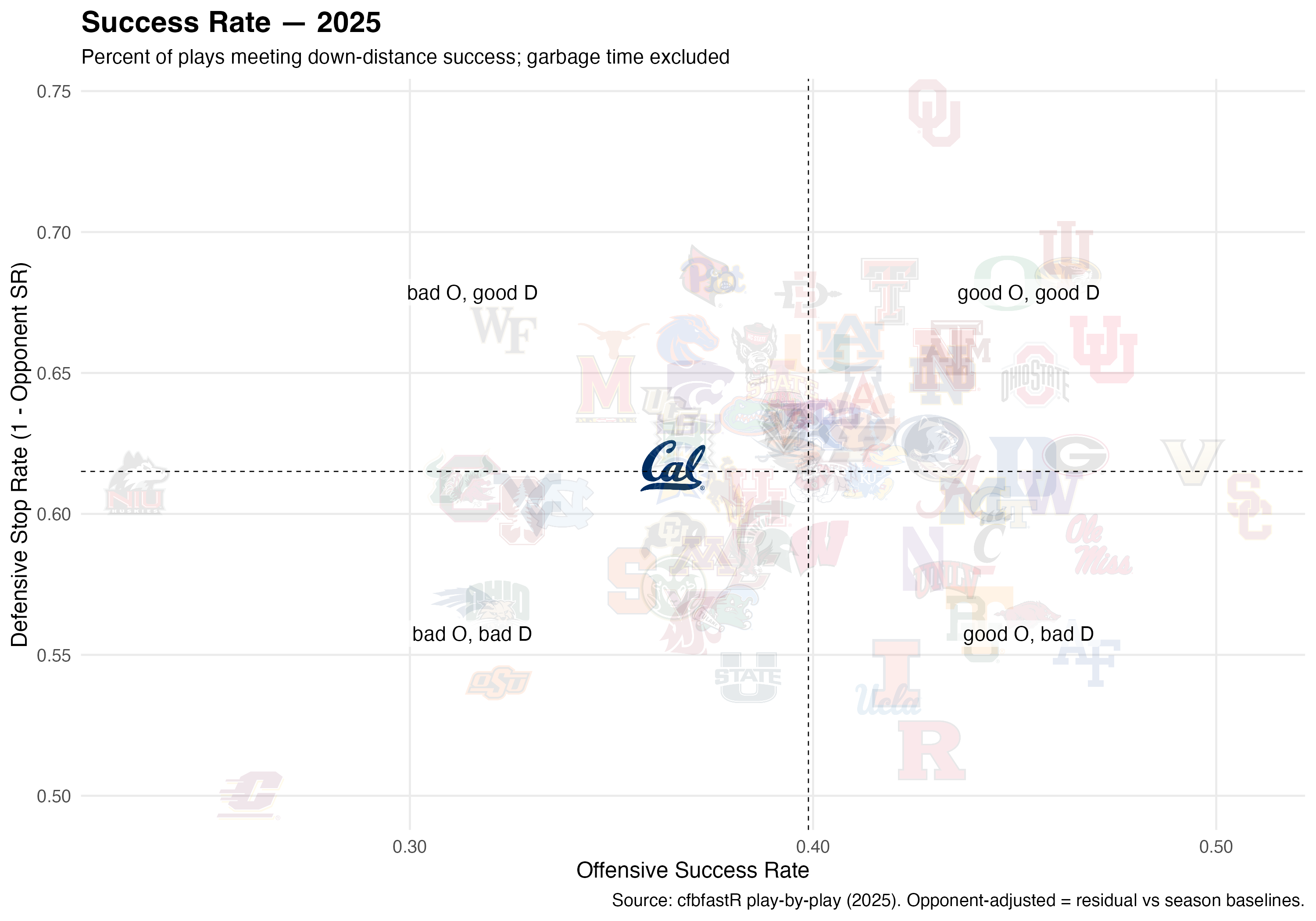 The final two plots—success rate and opponent-adjusted EPA/play—show how Cal’s offensive-defensive balance compares with other teams. In both, Cal is almost squarely in the middle of the pack: modestly above average on defense and slightly less than average on offense.