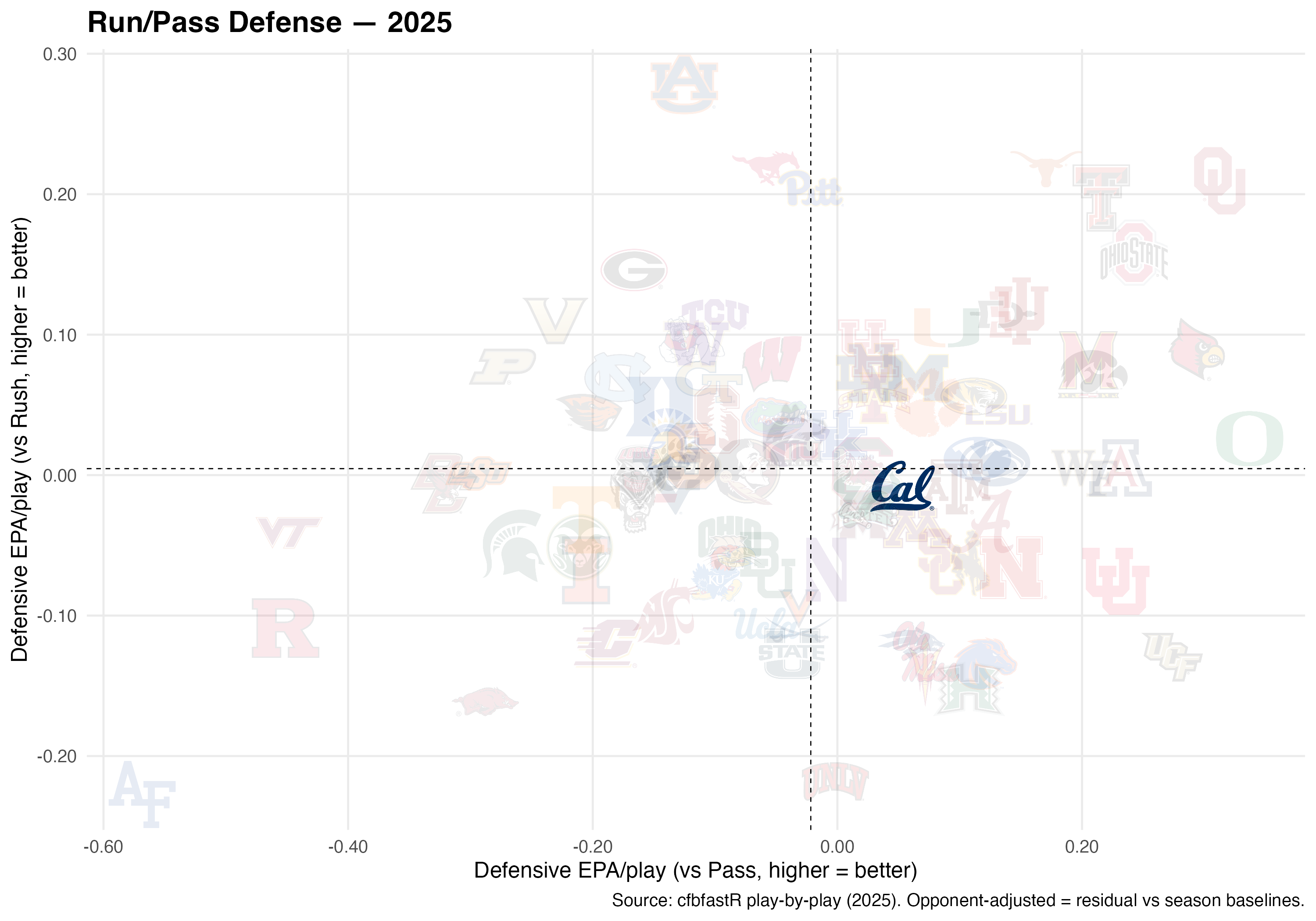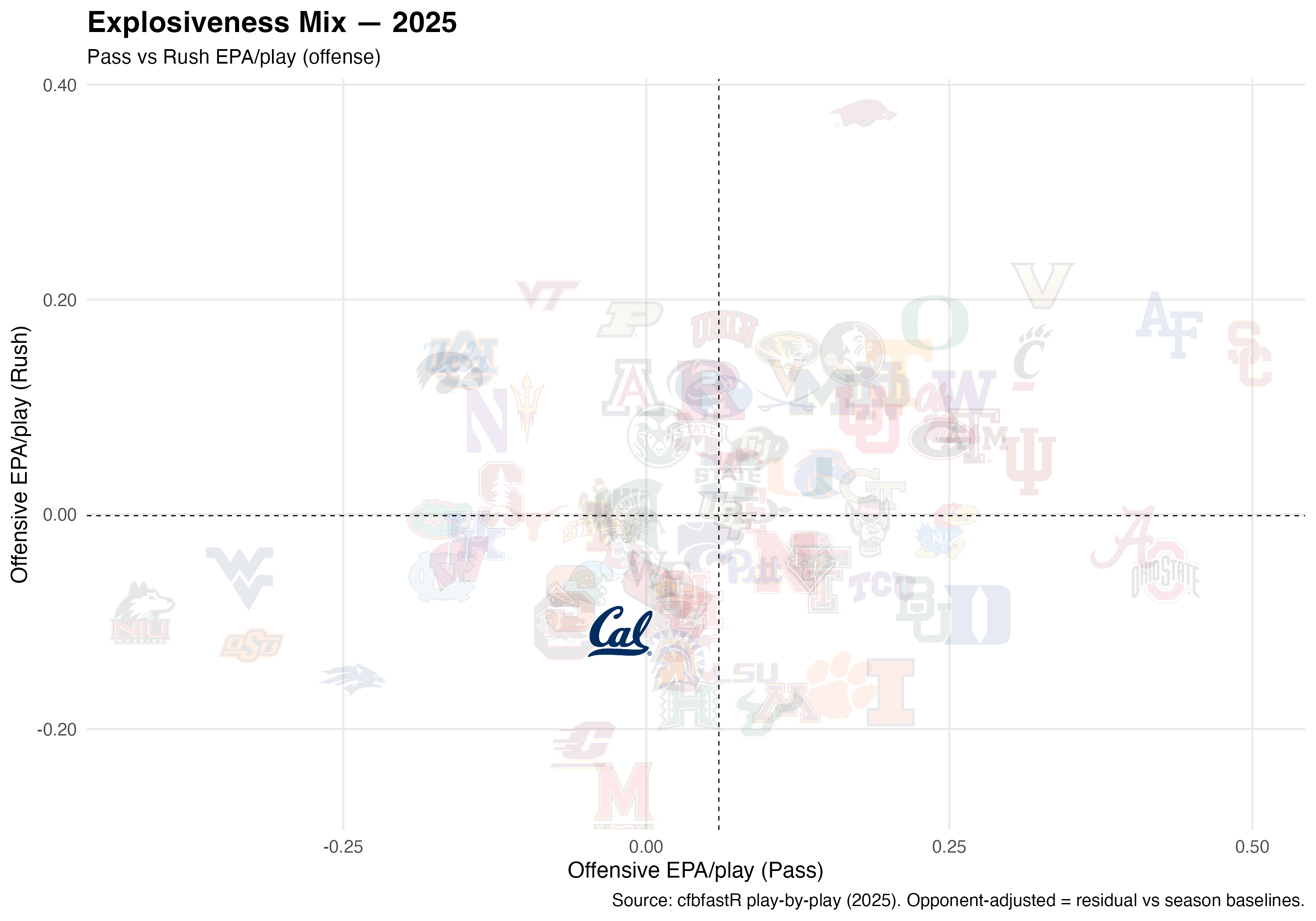 Cal’s explosiveness mix suggests an offense capable of making big plays, but inconsistent in sustaining drives. If the Bears can establish even a modestly effective run game, the offense could finally open up and take some pressure off of Cal’s defense.