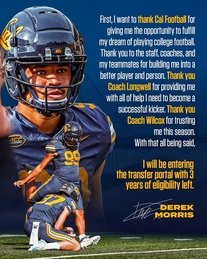 Some transfer portal news that happened during the holidays: Cal kicker Derek Morris decided to seek a new home.