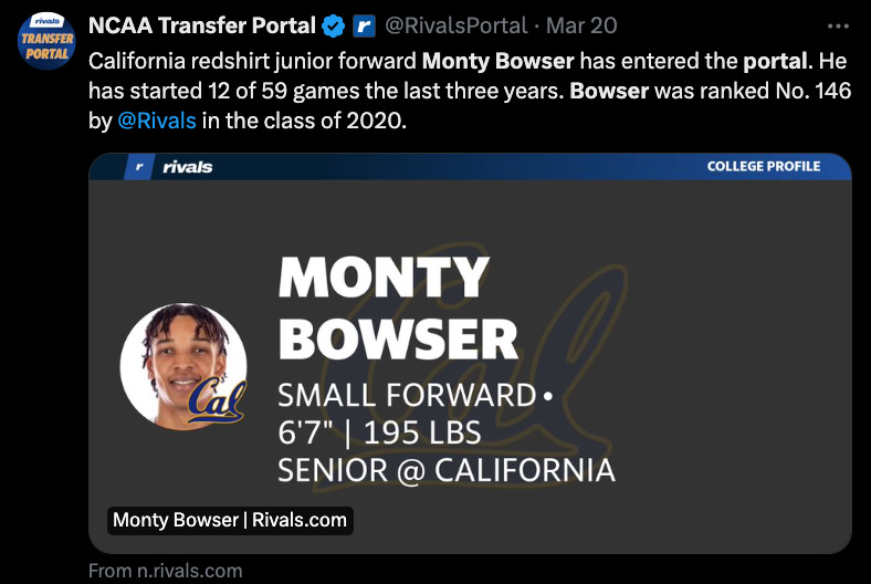 Another loss for Cal basketball came earlier this week, as Monty Bowser announced he will be entering the transfer portal as well. He becomes the fifth departure for the Bears for those with eligibility left.